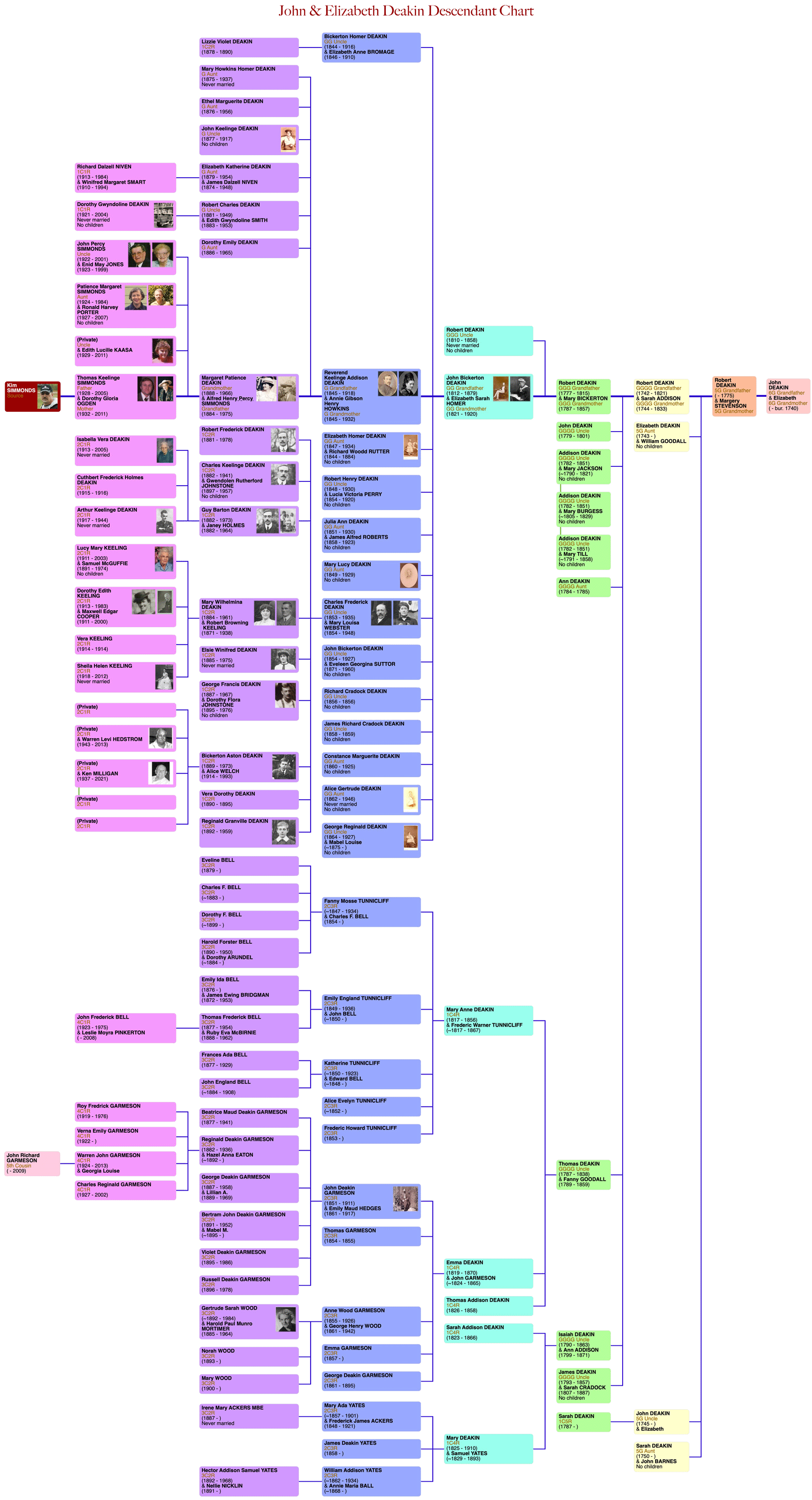 Descendant charts are read right to left with the start person on the right and following generations as you move to the left (ie. children, grandchildren and so on.)