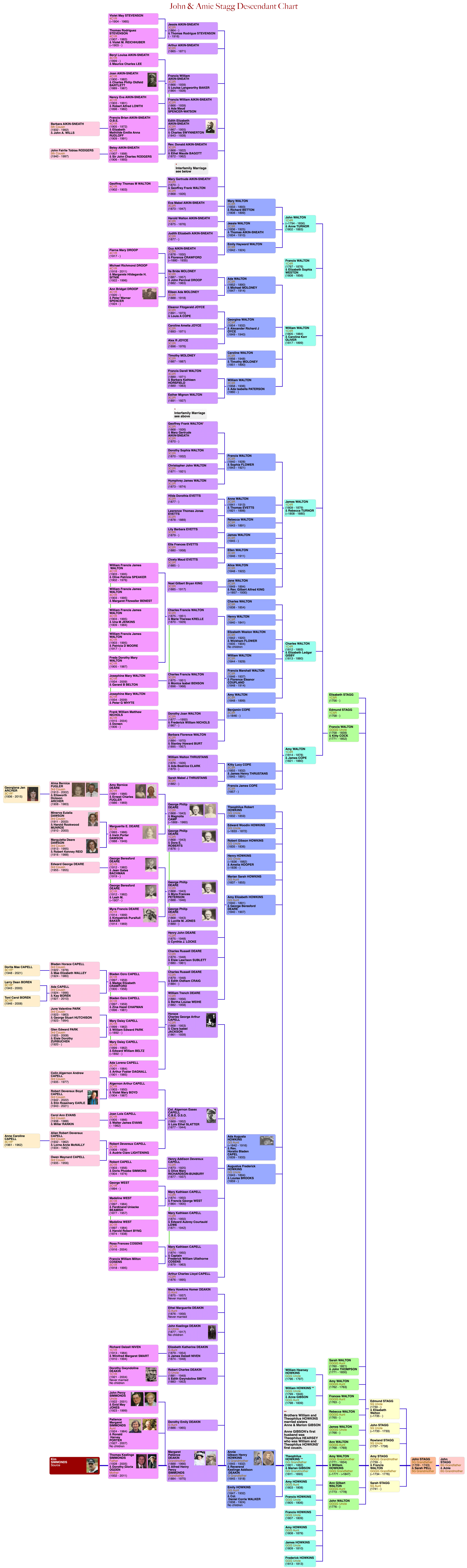 Descendant charts are read right to left with the start person on the right and following generations as you move to the left (ie. children, grandchildren and so on.)