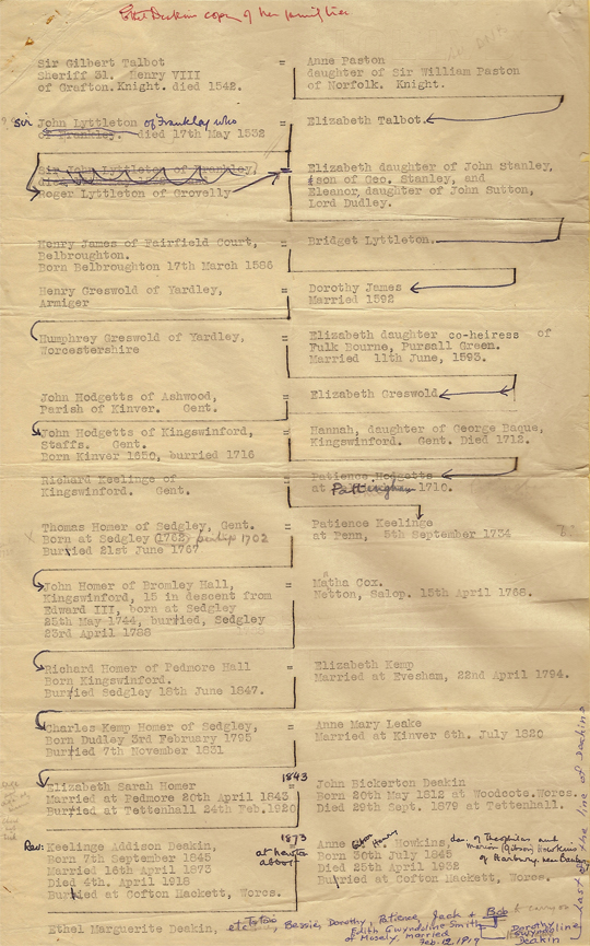 Deakin of Cofton Hackett, Worcestershire and Some of his Forbears, my paternal grandmother’s family. (Later I received the original typed version.) It went back to Gilbert Talbot, Sheriff of Worcestershire and Anne Paston from Norfolk. It indicated they were descended from King Edward III. The document was more than 50 years old. I was fascinated and bitten by the genealogy bug.
