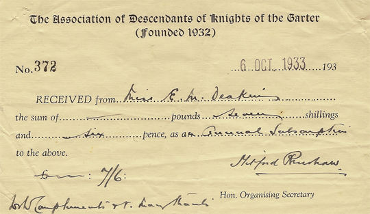 (founded 1932), as was her niece, Ethel Deakin. I am told they were quite proud of this fact. I actually have an original receipt from the Association for Great Aunt Ethel dated 6 October 1933 for 7 shillings and 6 pence, which I presume is her subscription fee. I also have a yellowed reprint from the 23 April 1933 Sunday Times entitled St. George’s Day Pageantry at Windsor, which describes a ceremony at St George’s Chapel, Windsor Castle involving the Association. It indicates their goal is to subscribe “to the task of caring for the cloisters and precincts of the shrine to their forefathers’ vows.”