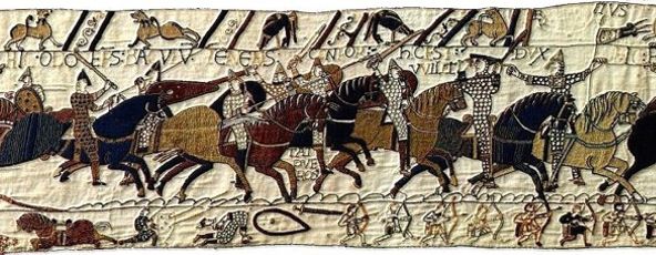 Scene from the Bayeux Tapestry Second from the right (looking back, lifting his helm showing he is alive) is William. “Here is Duke (Dux) William” On the right (looking and pointing back) is Eustace, “E[…]tius”, Latin for Eustace Second from the left is Bishop Odo (William’s half-brother) “Here Bishop Odo holding a club gives strength to the boys”